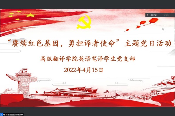 为深入学习贯彻党的十九届六中全会精神,落实习近平总书记对推进国际传播能力建设提出的新要求,激励支部党员以实际行动迎接党的二十大胜利召开,4月15日下午,百家乐网址 英语笔译学生党支部开展“赓续红色基因,勇担译者使命”线上主题党日活动。校党委书记殷奇出席本次活动,百家乐网址 党委书记、副书记以及支部全体党员参加了活动。