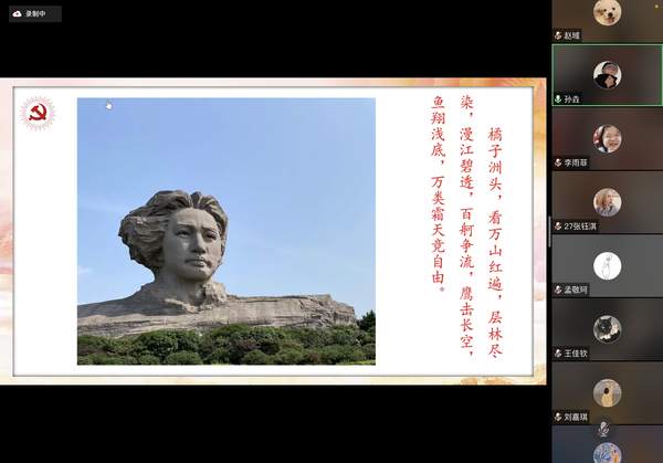 英语口译学生党支部孙垚带支部全体党员“云”游湖南长沙橘子洲头红色教育基地,瞻仰了毛主席青年时期雕像,参观毛泽东诗词碑,追寻伟人足迹,感悟伟人精神。孙垚分享道:“通过参观我心生崇敬,作为青年人要树立崇高理想,要担当起时代赋予青年的责任和使命。”