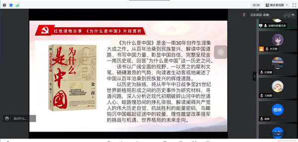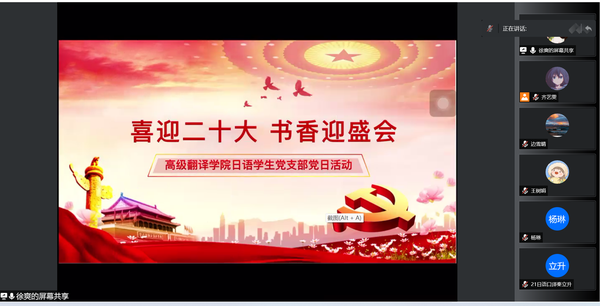 日语学生党支部开展“喜迎二十大 书香迎盛会”主题党日活动。《为什么是中国》一书生动客观地阐述了中国从百年沧桑到民族复兴的辉煌道路。通过对该书精彩片段的赏析,支部党员对百年沧桑巨变中的中国力量和中国故事有了更深刻的了解和思考,进一步增强了“四个意识”、坚定了“四个自信”、自觉做到“两个维护”。党员们表示,通过“云”上读书分享会活动获得了强大的精神激励,学习工作之余会抽出更多的时间多读书、读好书,做到学以致用、汲取力量、明确方向,为民族复兴伟业贡献青春力量。