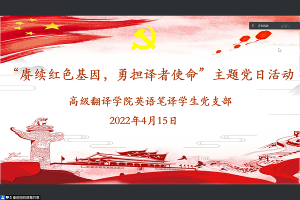 为深入学习贯彻党的十九届六中全会精神,落实习近平总书记关于推进国际传播能力建设的重要讲话精神,深入讲好中国故事,服务国家国际传播能力建设,英语笔译学生党支部开展“赓续红色基因,勇担译者使命”线上主题党日活动。专业教师华云鹏结合笔译翻译实际,谆谆告诫青年学生要牢记译者使命,不断提升专业素养,学习核心本领,用理论和实践武装自己,更加坚定地传承工匠精神,为服务国家重大发展战略和天津市经济社会发展接续努力。学生代表徐琳、乔梦萱分享了参与疫情防控发布翻译和中央文献外译的感悟,鼓励同学们勇担译者的使命与担当,为不断提升专业水平,砥砺奋进。
