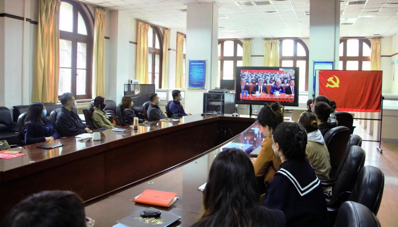 党委理论学习中心组成员、各党支部书记、新发展的学生党员在钟楼103室围坐在一起,集中收看大会报告,各党支部党员通过电视、网络直播等形式,采用集体观看和个人自主观看的方式,第一时间学习领会大会精神。