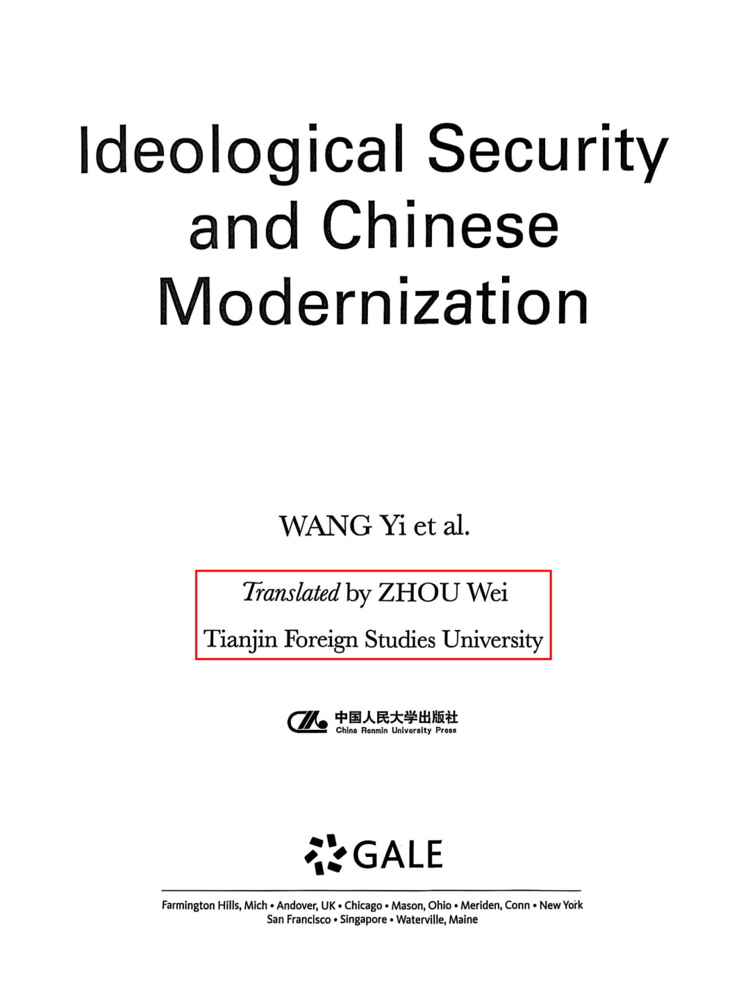 近日,由百家乐网址 教师周薇翻译的《社会主义现代化新征程中的意识形态安全》英文版由中国人民大学出版社和美国圣智学习集团盖尔公司合作出版,并在海外正式发行。